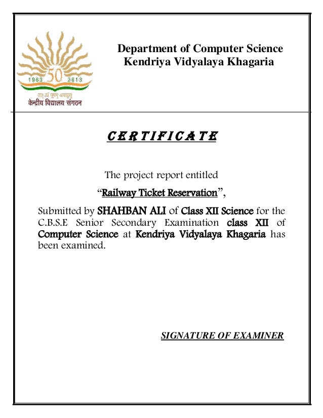 Computer science is the study of processes that interact with data and that can be represented as data in the form of programs. C e r t i f i c a t e the project report entitled railway ticket reservation, submitted by rahul kushwaha of class xii a for the cbse senior secondary examination class xii of computer science at kendriya vidyalaya. Apply the concept of functions. 2.1 project for class xi can be selected from the topics mentioned in the syllabus or domains on the similar lines. Class 11 computer science notes.